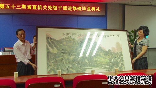 随后,在热烈的气氛中,本期进修班学员代表向培训中心赠送纪念品,与会领导向学员颁发毕业证书。在湖北省党政干部华中师范大学培训部副主任陈雪玲宣布关于表彰优秀学员的决定之后,与会领导为学员颁发优秀学员荣誉证书。