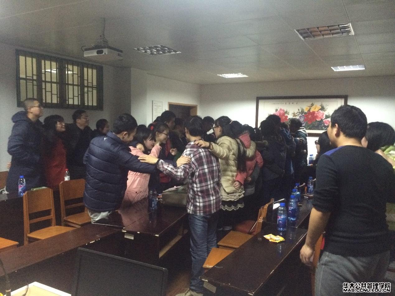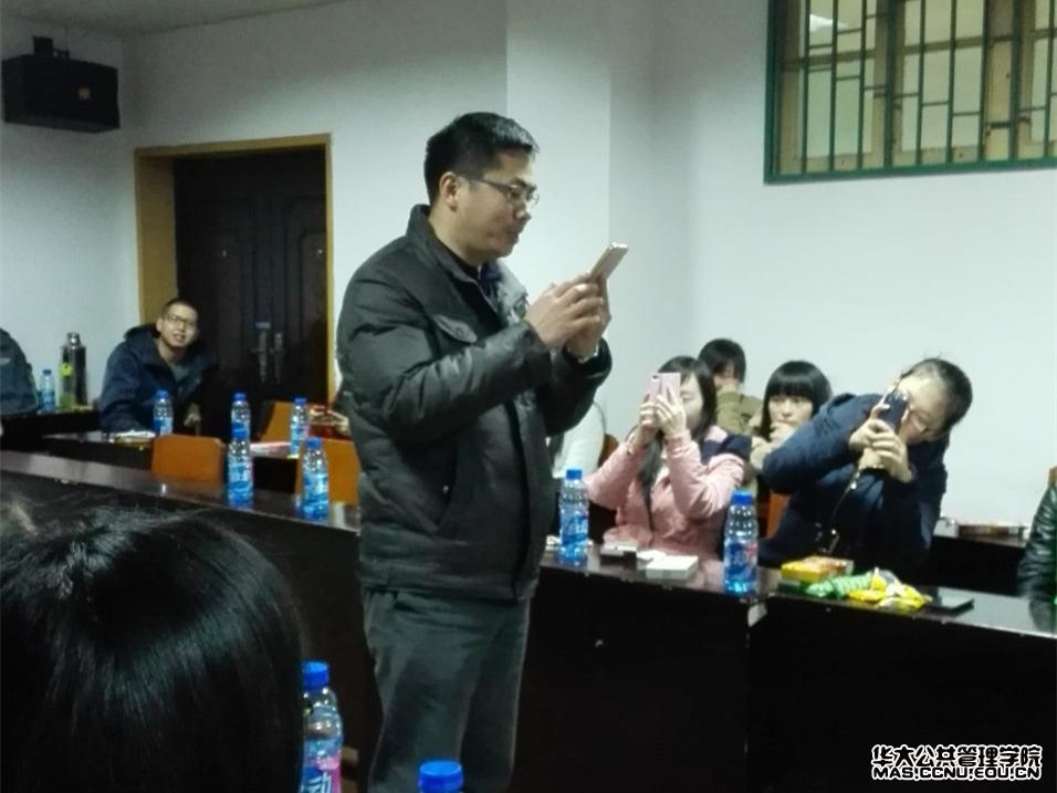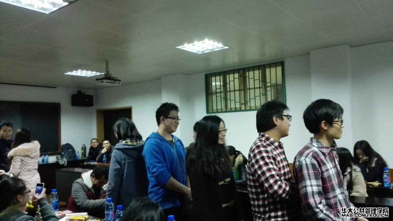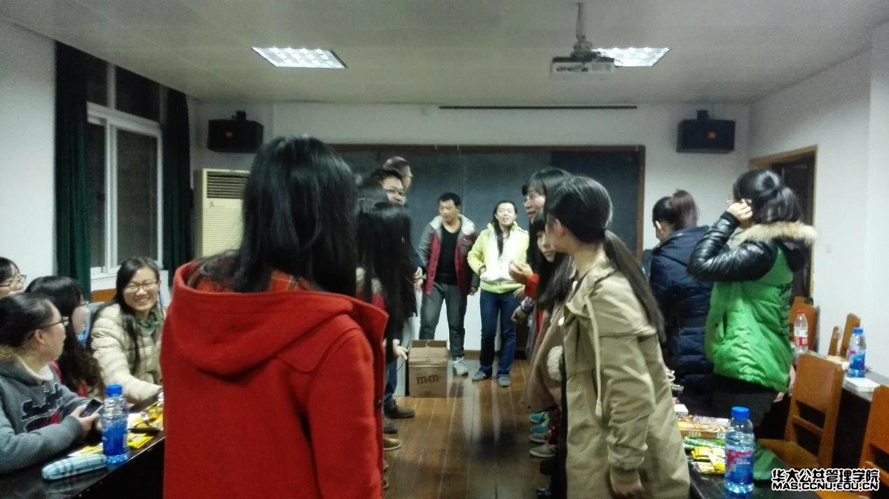 公共管理学院本科生讯(通讯员:彭赟琦 摄影:彭赟琦)2015年1月3日晚6点30分,公共管理学院本科2012级元旦联欢晚会在管院319教室举行。此次联欢晚会还邀请到了公共管理学院陈刚华老师和公共管理学院分团委书记、2012级辅导员王聪老师。
