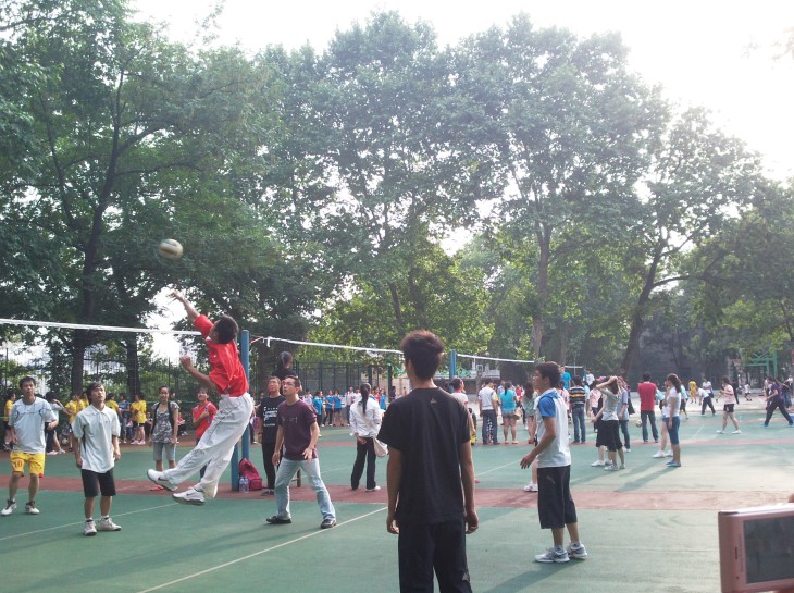 虽然昨天下过一场暴雨,但气温依然高居不下。下午16:30,管院男排队员潘兵强、孔祥海、龚毅、石轩等,就在烈烈骄阳下,开始了“华外杯”排球赛的征程。首战迎战政法学院。管院体育指导老师叶志强亲临现场进行指导。