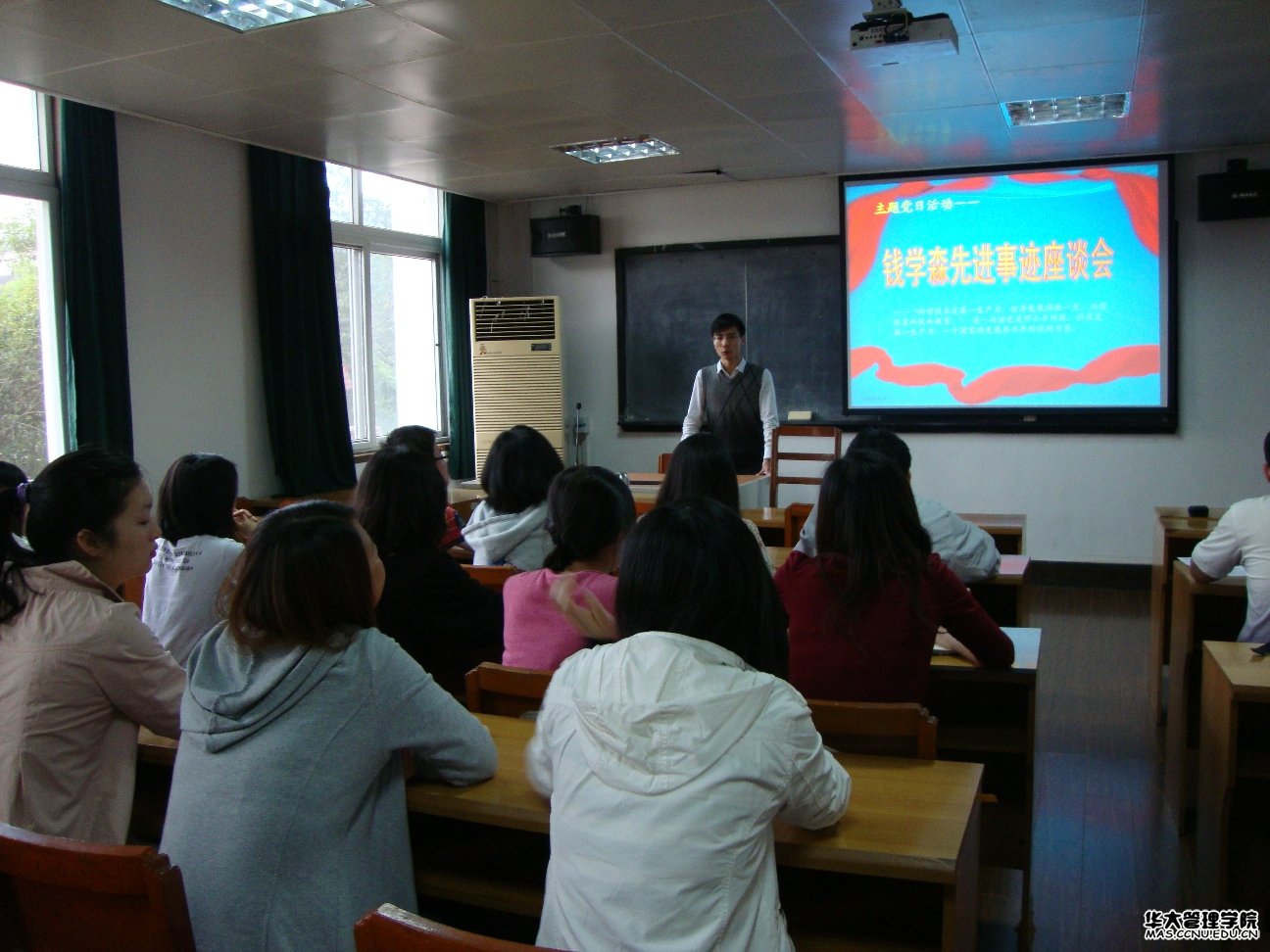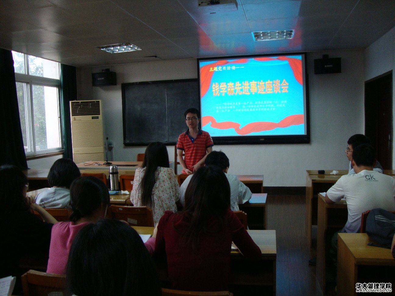 为纪念人民科学家钱学森同志诞辰100周年,深入学习领会钱学森崇高的共产主义理想和爱国主义情怀。2012年4月22日,我院本科党员一支部在管理学院419教室召开学习钱学森同志先进事迹座谈会。本科一支部党员、预备党员参加座谈会,会议由党支部组织委员刘栩源主持。