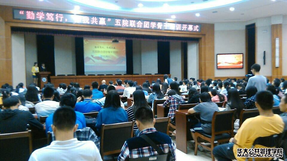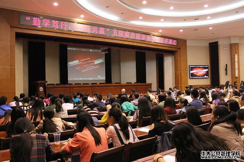公共管理学院讯 为了促进公管、历院、马院、体院、物院五院团学骨干的交流,增强团学骨干的整体素质,提升团学骨干适应新环境,接受新挑战和解决新问题的综合能力,华中师范大学公管、历院、马院、体院、物院五院联合于2014年10月25日晚七点在科学会堂一楼报告厅举行了主题为“勤学笃行,你我共赢”的五院联合团干培训开幕式。此次活动邀请到公共管理学院党委副书记马新华、体育学院党委副书记胡国良、物理科学与技术学院党委副书记吴建成、校团委组织部王涛、公共管理学院团委书记王聪、历史文化学院团委书记秦玉琴、马克思主义学院团委书记王海龙、体育学院团委副书记洪满春、物理科学与技术学院团委副书记刘倩等嘉宾。