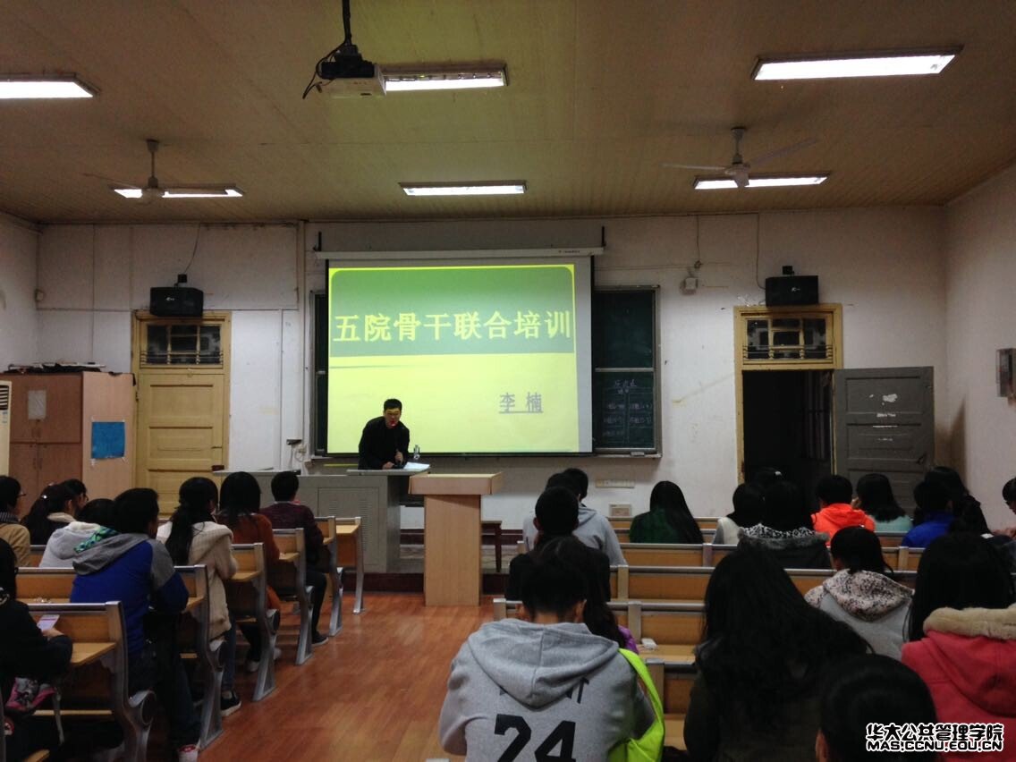 公共管理学院讯 2014年11月8日“勤学笃行,你我共赢”五院联合团干培训第三期顺利举行。此次院干培训于下午5点历史文化学院进行,宣传培训于晚上7点公共管理学院319教室进行。