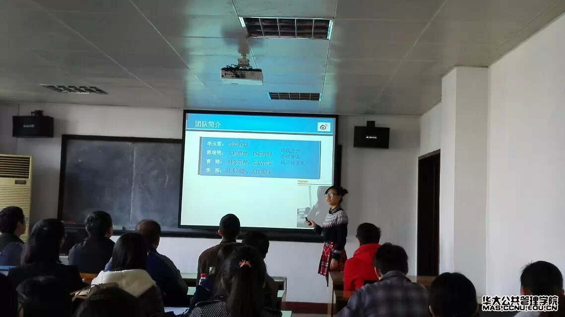 第三组展示的是崔学昭团队,她们所研究的项目为微博维权的作用机制及其公共能量场效用分析,展示之后“微博专家”费军老师提出了一些意见,如数据过老,要寻找新数据,姚锐敏、陈刚华等老师也提出了宝贵的意见。