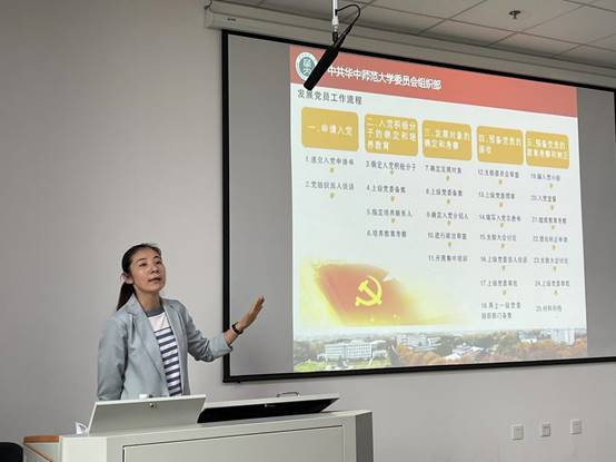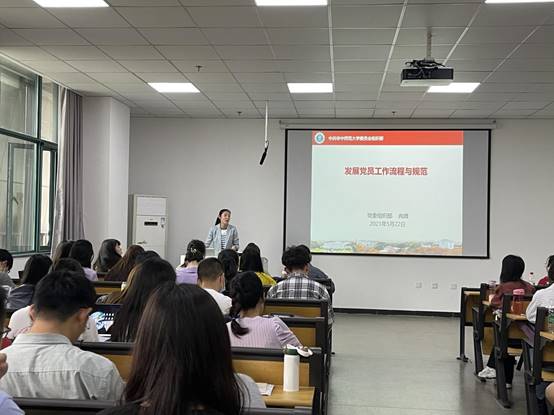 随后,她以2014年6月中共中共中央办公厅印发的《中国共产党发展党员工作细则》为依据,向党支部书记系统详解了该通知中发展党员工作的具体要求和步骤。她指出,发展党员工作流程分为五个步骤、25个环节,并逐一介绍了每个环节需要注意的事项,同时强调了发展党员工作环节中的三个关键时间节点。期间,她围绕“发展党员工作中关于延长预备期”、“如何处理未满18岁申请入党和发展党员”等具体问题,与同学们开展了互动式教学和交流。