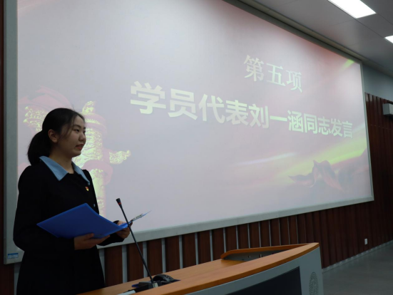 公共管理学院本科生党支部预备党员刘一涵作为学员代表发言。刘一涵首先对党组织、学校和老师们的栽培表示感谢,并表态要珍惜难得的学习机会,认真听讲,积极思考,努力把理论学习内化于心、外践于行,将个人的小我融入群体大我,将青春奋斗融入党和人民事业。