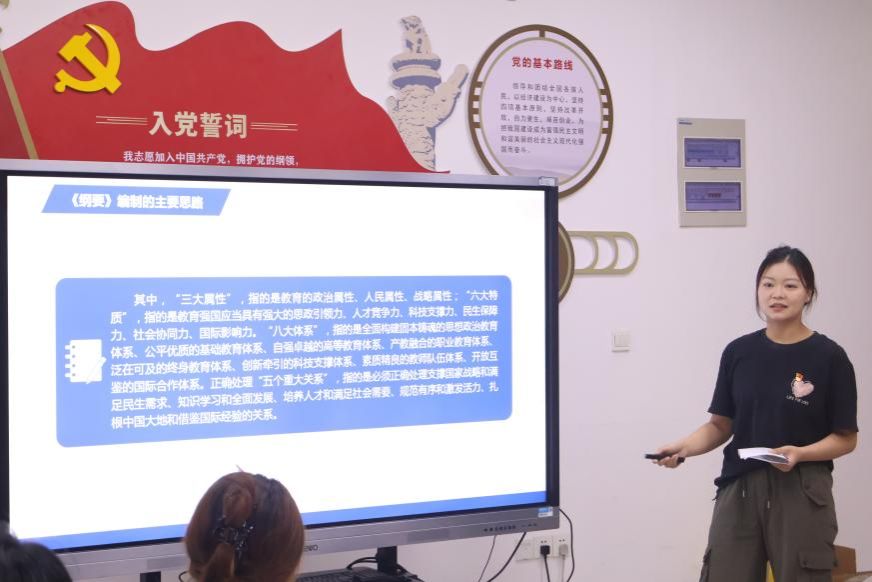 王菲同志结合专业特色分享学习《教育强国建设规划纲要(2024—2035年)》的心得体会。她指出,教育强国建设是中华民族伟大复兴的基础工程。作为社会保障专业的党员,要学会在运用专业知识破解教育公平难题的同时,积极参与实践活动,践行初心使命。