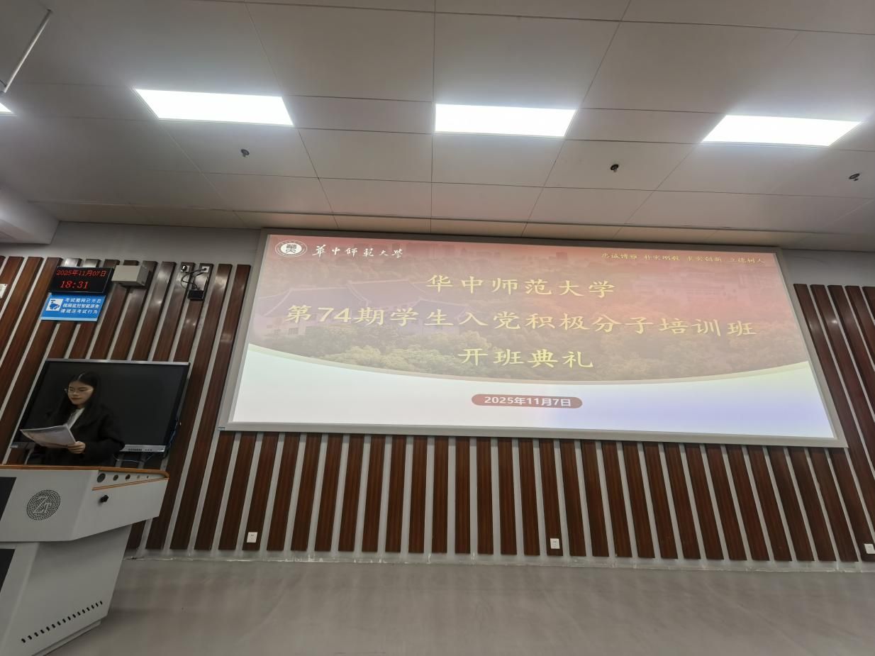 公管在线讯(通讯员 杨宇晨)2025年11月7日晚18:30,华中师范大学第74期入党积极分子集中培训班第五教学班开班典礼在南湖综合楼N207顺利举行。公共管理学院正处职组织员杨帆、人工智能教育学部党务干事田璐、公共管理学院党务干事李蓓,公共管理学院和人工智能教育学部的113名学员参加。开班典礼由公共管理学院研究生2024级党支部书记葛雪琪主持。