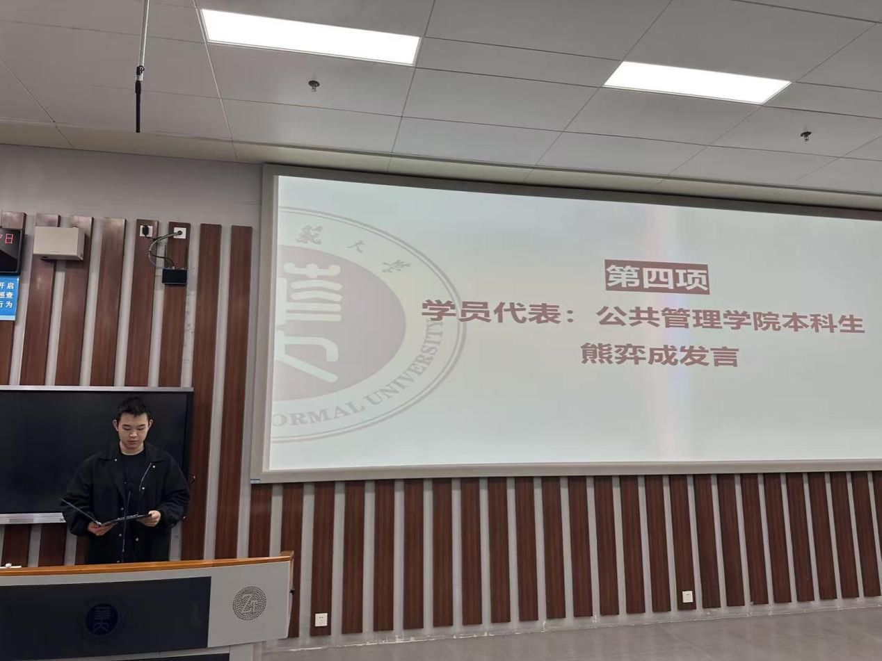随后,公共管理学院熊弈成同学作为学员代表发言。他表示,青年兴则国家兴,青年强则国家强,入党积极分子培训是筑牢思想根基、锤炼党性修养的关键政治历练,他呼吁全体学员锚定目标、端正态度,严守纪律、互帮互学;以高度政治自觉投入党课学习,用科学理论武装头脑;做到知行合一,在思想上政治上行动上同党中央保持高度一致,成长为堪当民族复兴重任的新时代好青年,为实现第二个百年奋斗目标不懈努力。