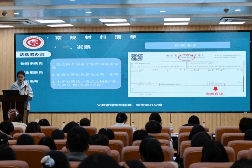 团委副书记(学生)张婧怡从组织建设、学风建设、后勤保障、文体活动、社团活动、宣传工作、志愿服务、团员管理与发展等八个方面汇报了各部门2024-2025学年第一学期工作情况。办公室主要负责人王梓雪从活动筹办、物资采购、酬金报酬三种不同的情况详细讲解了财务报账规范。