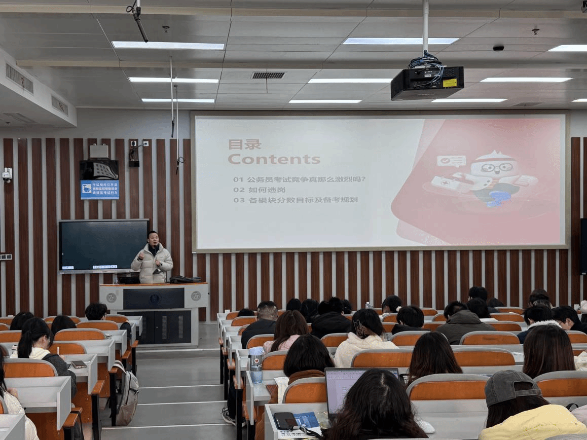 公管在线讯(通讯员 莫静薇)为帮助学生提前了解公务员考试信息、掌握科学备考方法,3月16日晚,公共管理学院在南湖综合楼N327教室举行“管出精彩 理出未来”就业提升计划之公考备战指导讲座,粉笔公考数量关系与资料分析研究院院长贾慕白担任主讲人,全体2022级本科生参加,活动由本科生辅导员张子规主持。