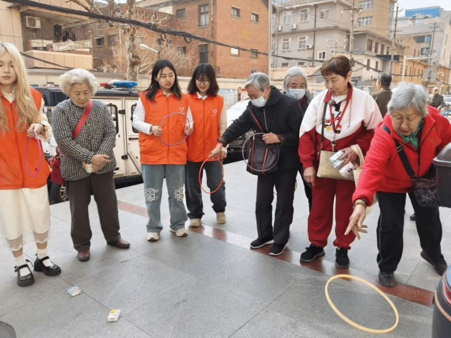 表演结束后,志愿者们组织了猜歌游戏和套圈游戏。一首首耳熟能详的经典歌曲旋律响起,老人们纷纷凝神细听、踊跃抢答。老人们全神贯注地瞄准目标并抛出手中的套圈。现场气氛热闹非凡。