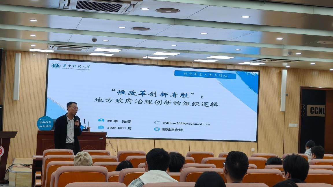 公管在线讯(通讯员:赵凌峰 李桂莲)2025年11月21日下午4点,第91期“百年求索·杰青讲坛”于南湖综合楼N8001顺利举行。本次讲坛邀请公共管理学院魏来教授担任主讲人,吸引各学院百余名学生参与。本次讲坛由华中师范大学研究生会主办,公共管理学院研究生会、人工智能教育学部研究生会承办,计算机学院研究生会和马克思主义学院研究生会协办。