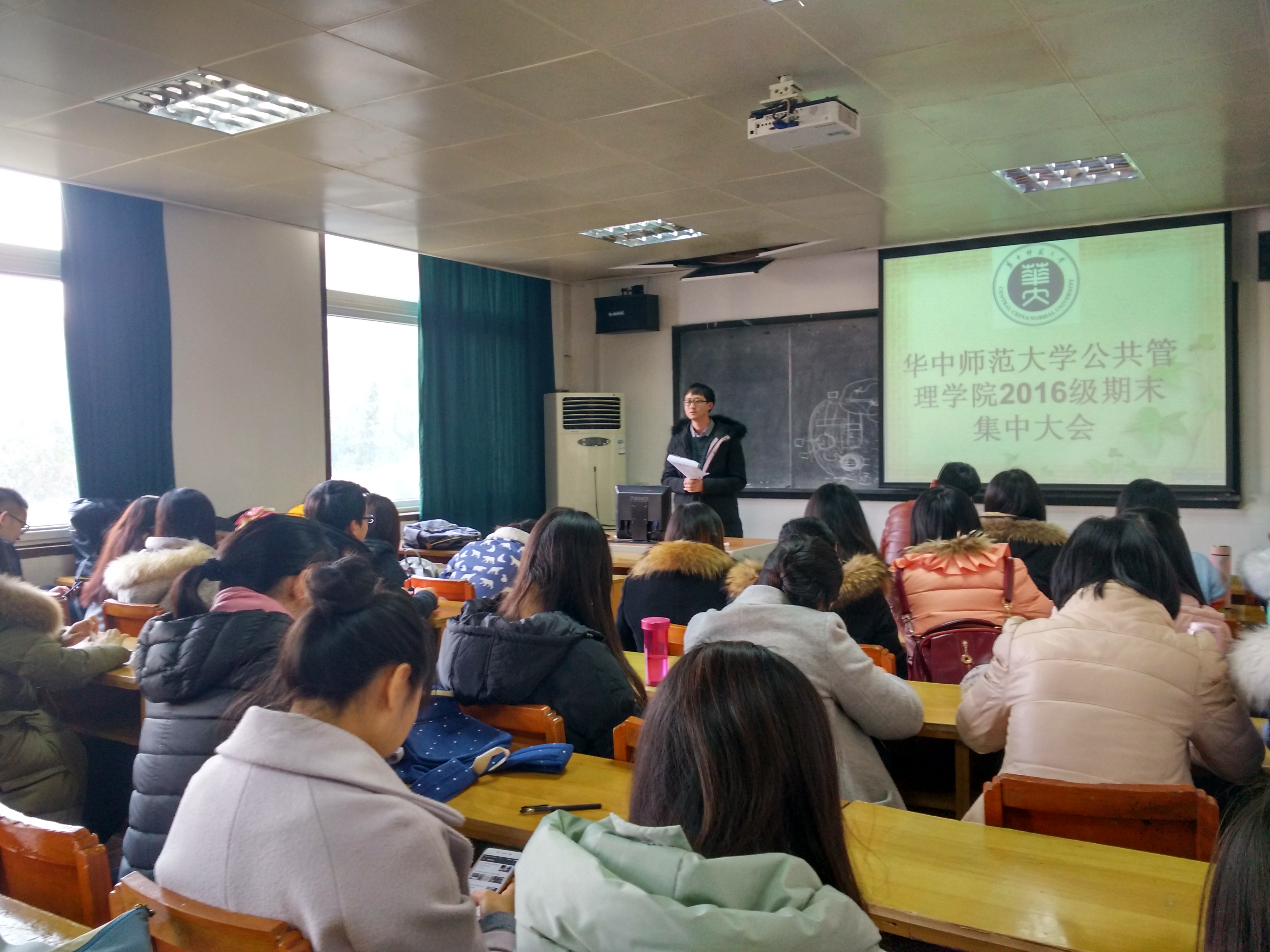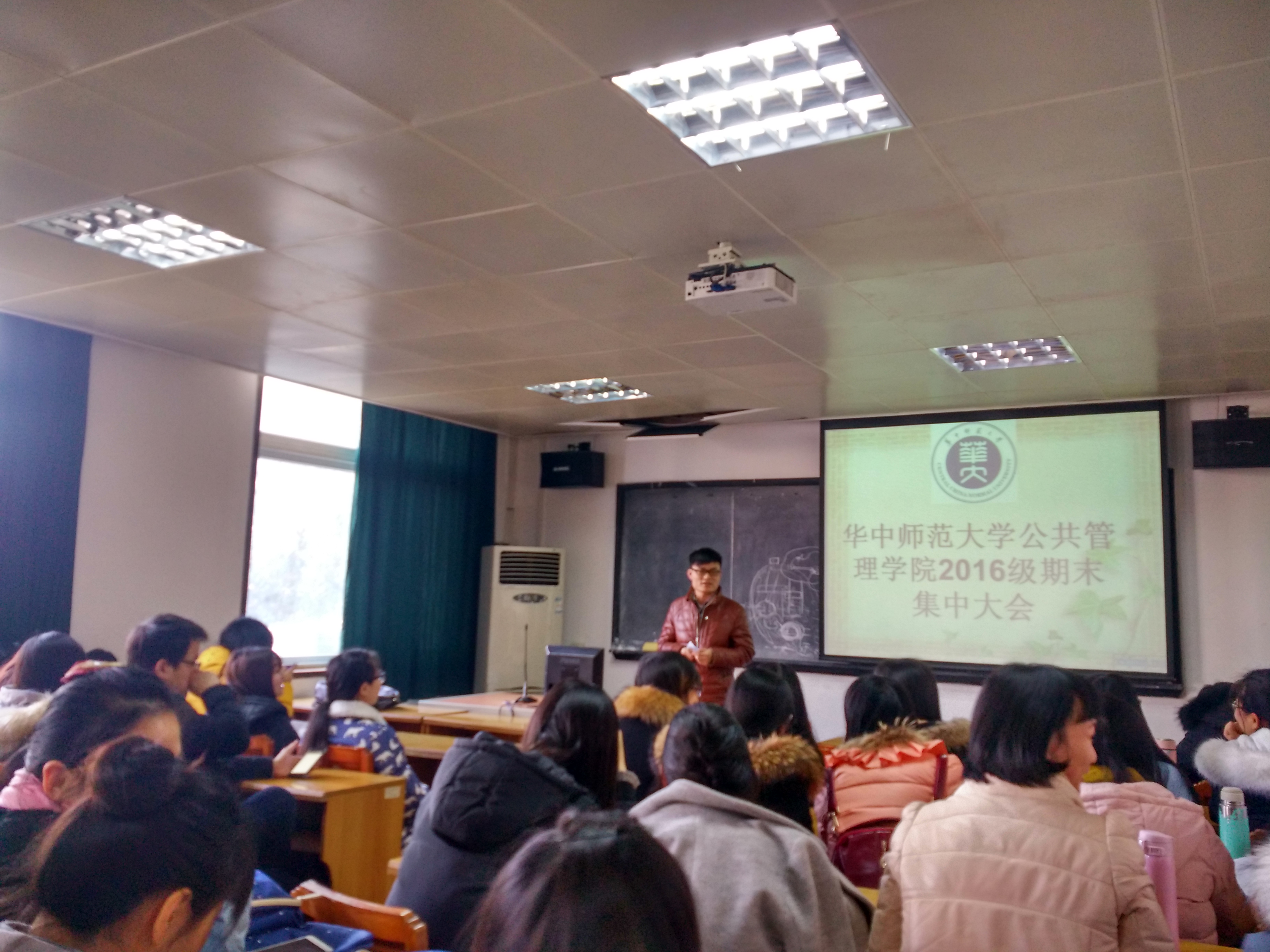 公共管理学院研究生讯(通讯员:徐杰智)2016级研究生期末集中大会于12月16日上午11点30分在我院319教室举行,研究生教学秘书欧阳铮老师、辅导员魏寅老师、兼职辅导员童志阳学长及2016级全体研究生参与此次大会,此次大会由孙振辉主持。