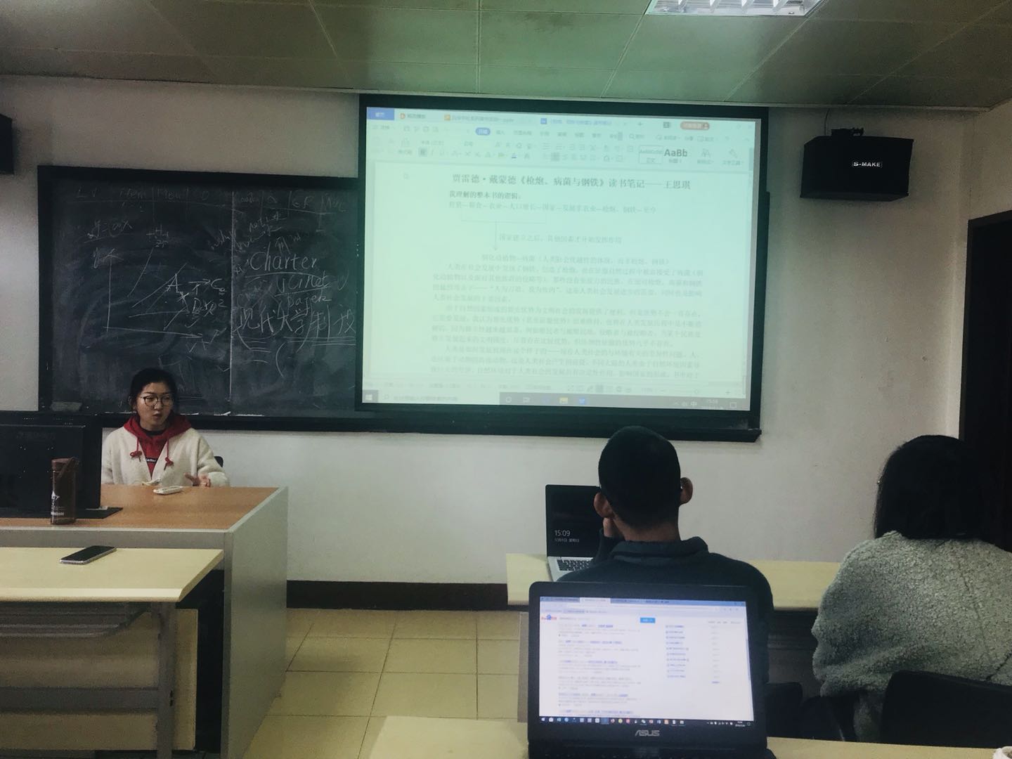 在活动开始阶段,主持人王思琪同学对本次系列读书主题进行简要阐述,并提出了对《枪炮、病菌与钢铁》一书的思考,举出了“为什么是欧亚大陆人率先拥有了枪炮病菌与钢铁??”关于地理环境对人类历史文明影响到底有多大?”等问题。