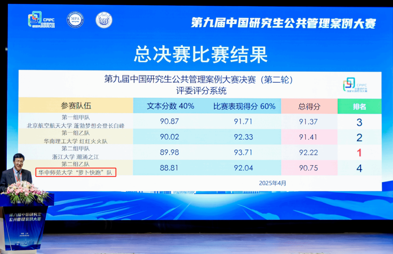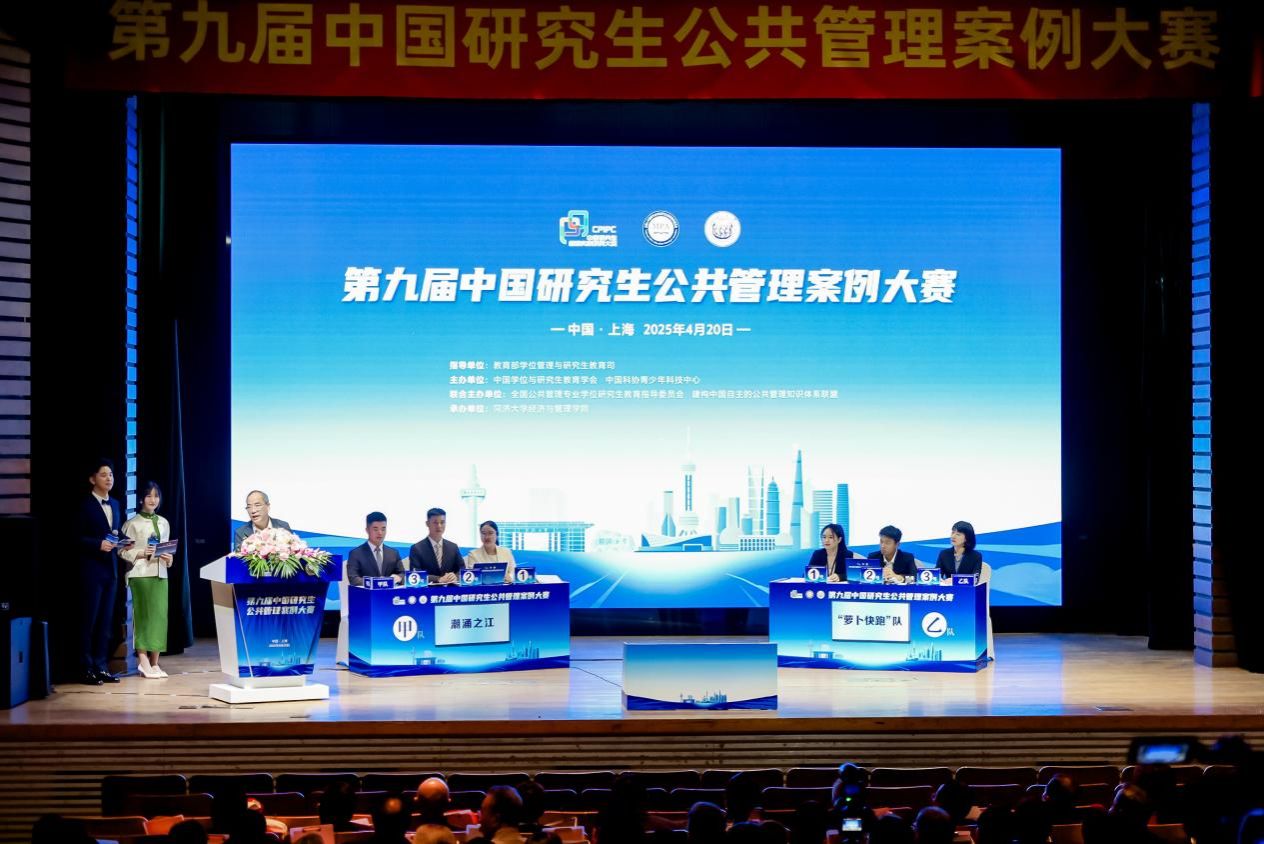 公管在线讯(通讯员:魏来 余成龙)4月20日,第九届中国研究生公共管理案例大赛决赛在上海同济大学圆满落幕。公共管理学院院长、MPA教育中心主任徐增阳教授,MPA教育中心副主任魏来教授,以及参赛队伍师生赴现场参加比赛。由公共管理学院教师魏来、余成龙、冷向明指导,研究生熊伊婷、王治峰、尹杨晶组成的“萝卜快跑队”,在3115支队伍中脱颖而出,入围全国32强,在决赛第一轮中成功进入全国4强,最终与来自浙江大学、北京航空航天大学、华南理工大学的本届赛事全国最高分队伍共同进行擂台展演,获得全国一等奖(原“特等奖”),实现历史性突破!