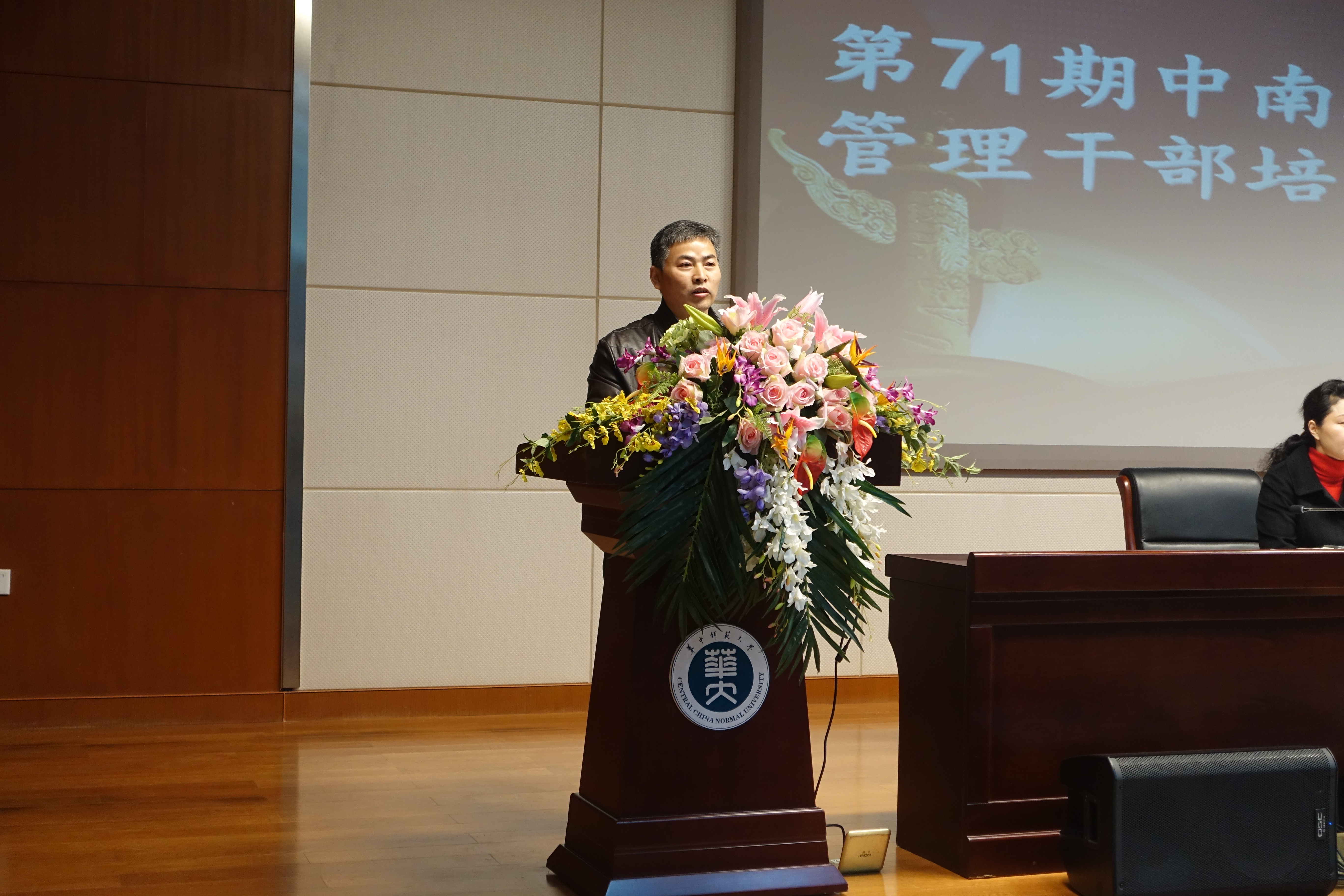 公共管理学院院长卢新海代表华师向中南干训班的学员表示欢迎,随后向各位学员介绍了培训中心的办学历史以及办学优势。最后他表示希望各位学员能够珍惜在华师的学习时光,努力奋进,学有所成。