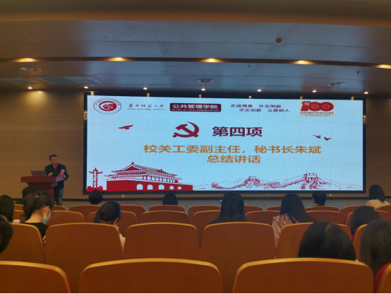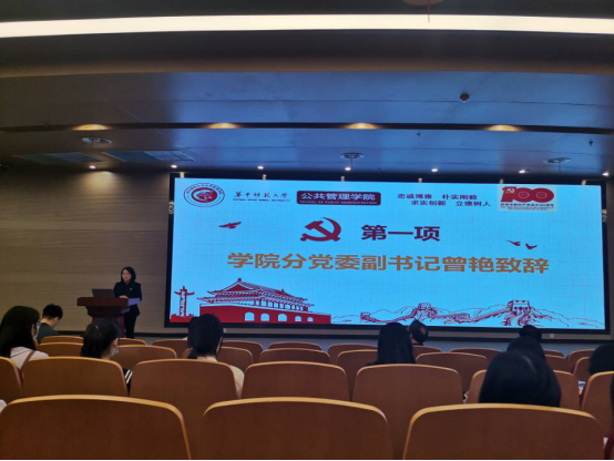 学院党委副书记曾艳在讲话中强调了党史学习教育的重要意义,她指出,公共管理学院的学生担负着良治中国、善政天下的时代重任,更应该学好党史,从百年党史中汲取思想营养,用共产党人的优秀品质激励自己,坚定理想信念,立德勤学笃行,努力使自己成长为爱党爱国爱社会主义的时代新人,为日后实现中国梦奉献智慧和力量打下扎实基础。