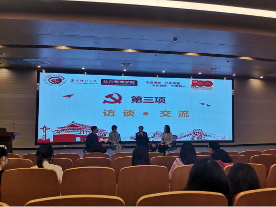 在访谈交流环节中,佐一男老师就“新时代青年学生如何应对新机遇新挑战”问题向石丹林教授请教。石教授告诫同学们要保持人生定力,定下奋斗目标,坚持不懈向红色道路靠拢。针对“从学生到工作,如何保持初心和激情”这一问题,黎萍劝勉各位同学要坚定理想,善于检视、批评自己,不轻言放弃。被佐老师问及 “在校生如何提升精神境界”时,姚师洋用习总书记的寄语“踏踏实实做事,踏踏实实做人”与大家共勉,建议大家走出宿舍,参与志愿服务,加强实践锻炼,做有德有才的新时代青年。