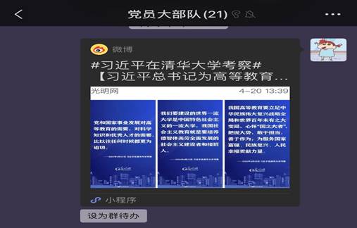 在清华大学建校110周年校庆日即将来临之际,中共中央总书记、国家主席、中央军委主席习近平19日上午来到清华大学考察,先后视察美术学院、成像与智能技术实验室、重点教学科研成果展示、西体育馆,了解学校深化改革、人才队伍建设、教学科研创新和服务国家发展等情况。随后,习近平与师生代表座谈并发表重要讲话。公共管理学院研究生党支部组织线上学习,学习习近平总书记座谈会讲话精神。