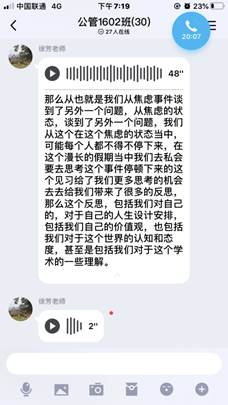 1602班班主任徐芳老师组织了一场以“疫情背景下对公共管理的反思”为主题的班会。徐老师向大家讲述了对公共管理现状的思考,尤其是对基层社区的认知。此次班会用时达七十分钟,同学们踊跃发言,积极探讨,师生互动热烈,同学们受益无穷。