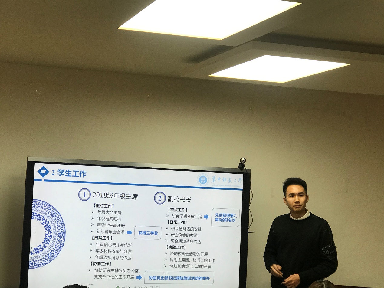 其后,本次优秀研究生评选正式开始。参加评选的研二、研三的同学依次上台进行评选展示,从专业科研、社会实践、社会公益、志愿活动等多个方面展示了自己研究生入学以来的收获和成绩。评选活动结束后,评委会进行了现场投票,根据投票结果选出优秀研究生。这是一个总结、回顾的过程,同时也是一个学习、展望的过程。