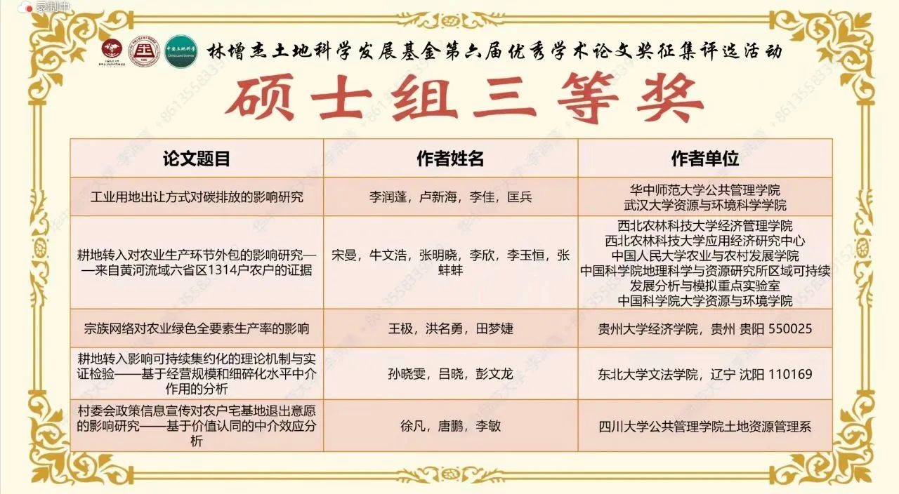 2023年6月25日,中国人民大学公共管理学院、林增杰土地科学发展基金会同《中国土地科学》编辑部主办的“林增杰土地科学发展基金第六届优秀学术论文奖征集评选”活动以线上会议的形式成功举行。我院土地资源管理专业2021级硕士生李润蓬在会议上进行了题为《工业用地出让方式对碳排放的影响研究》的论文宣讲,并荣获硕士组三等奖。