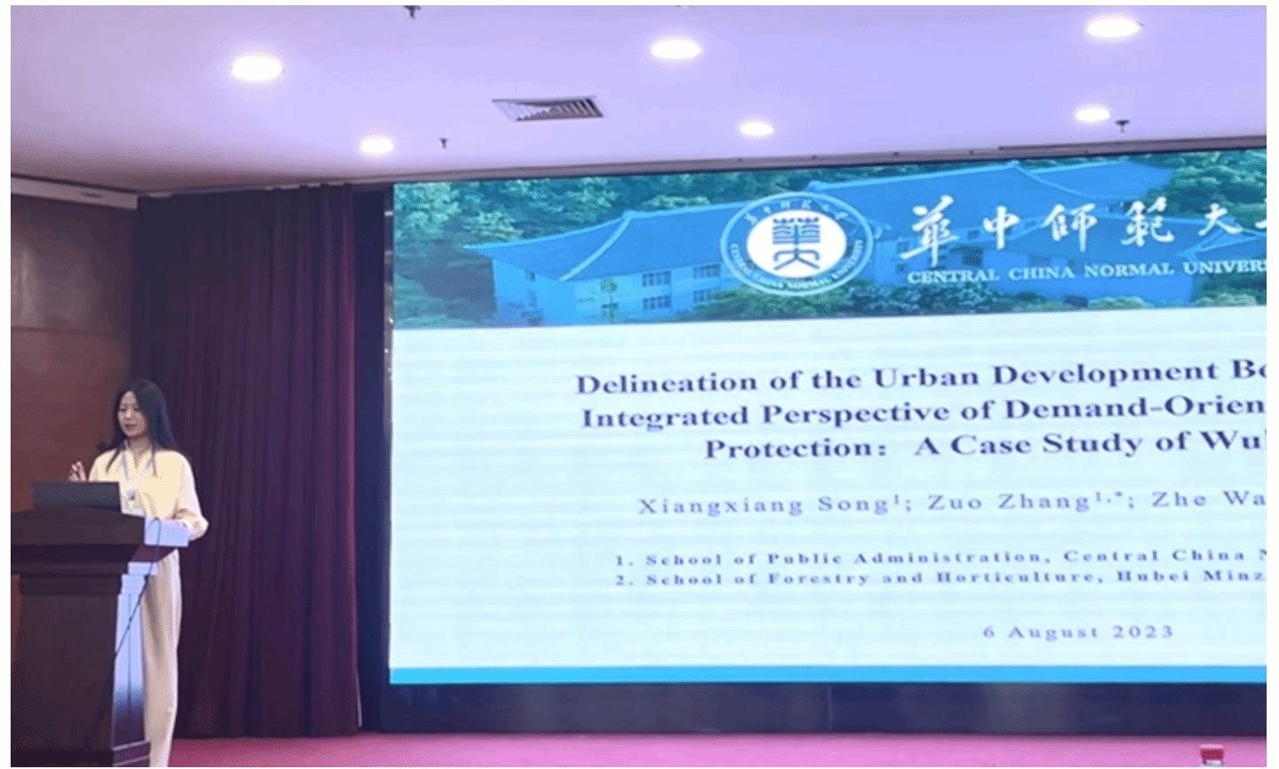 张祚教授受邀担任本次会议“土地利用与从城市规划”平行分论坛主席。博士研究生宋湘湘代表导师课题组作了题为“Delineation of the Urban Development Boundary Under the Integrated Perspective of Demand-Oriented and Ecological Protection:A Case Study”的英文学术报告。