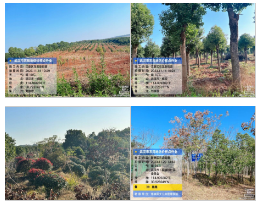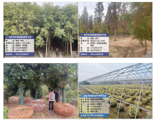 “翠影婆娑韵古风,千树万叶舞清林。”在江夏区乌龙泉街道友爱村,杨桐林场的胡经理向团队介绍,林场从94年到现在有近30年,八百多亩的林地上主要种植香樟、广玉兰、紫薇和石楠等30个品种。在谈到成本收益时,胡经理说:“与短周期的农田作物相比,林木生长周期较长,价格波动较大,但同时也具有较强的抗灾性,便于管理。”而在新洲区三店街道的院墙村,彭主任介绍到,院墙村人少地多,为实现撂荒闲散之地的集中利用,村集体于2021年按照每亩300元的标准承包了本村370亩土地。其中,被承包的土地大都是集中连片地,用来种植香樟、玉兰等乔木,红继木球和红叶石楠等灌木,以景观树销售为主。在蔡甸区侏儒山街道军营村,团队也参观了苗圃基地。大户细致阐述了从育苗到销售的各项投入成本和效益情况,为团队后续林地估价提供了宝贵支持。这一系列的调研,即展现了武汉市丰富多彩的林地资源,也诠释了农民在林业发展中的不易。
