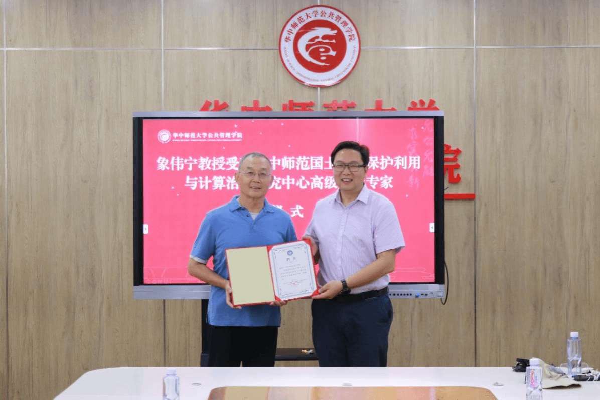 讲座伊始,王海书记向象伟宁教授颁发华中师范国土空间保护利用与计算治理研究中心高级智库专家聘任证书。。
