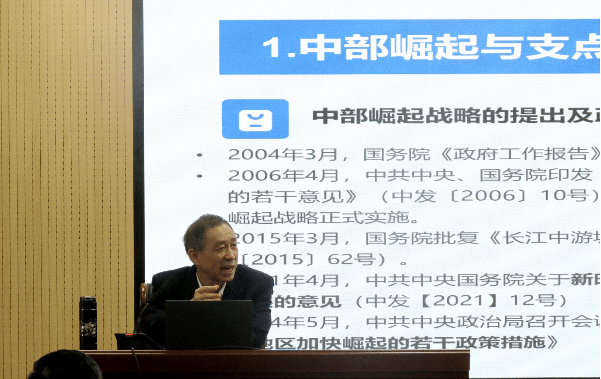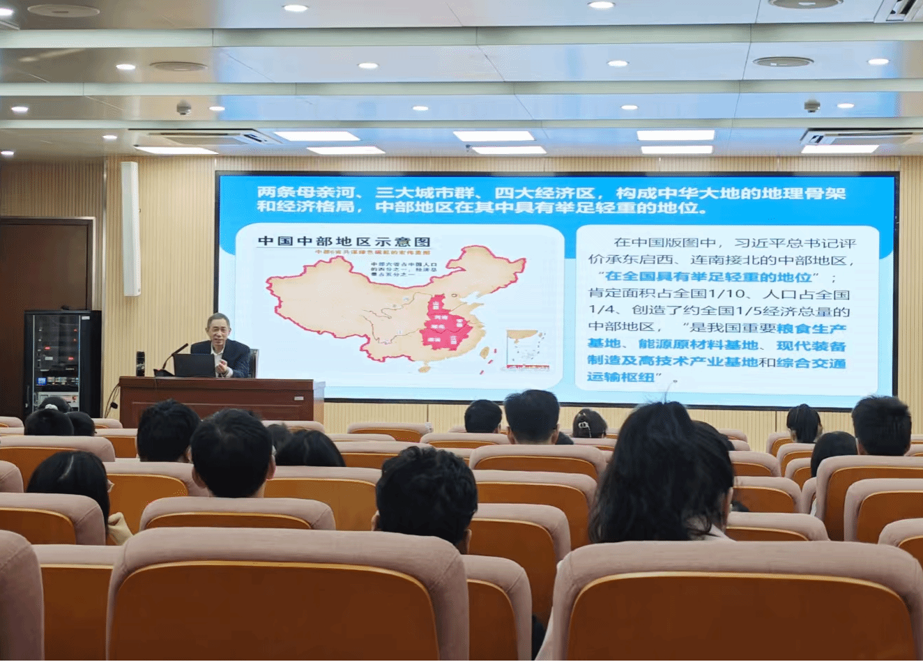 讲座中,邹德文教授围绕湖北建设中部地区崛起战略支点的使命目标,详解了集综合交通、科技创新、先进制造、内陆开放于一体的“四维枢纽”体系。交通维度上,武汉天河空铁枢纽等超级工程推动“九省通衢”向“九州通衢”跨越,通过高铁网与航空网络深度融合,实现3小时联通长三角、成渝等经济圈;开放维度上,湖北以陆海空三个“丝绸之路”为抓手,从内陆腹地向开放高地转型,货物吞吐量与开放能级持续攀升;先进制造与科技创新则作为枢纽核心支撑,让交通优势转化为供应链优势,科创资源转化为发展胜势。邹教授重点阐释了科技创新作为湖北“最大优势”的实践逻辑,通过“四链融合”机制与中试平台建设,湖北将实验室“盆景”转化为产业“风景”,区域综合科技创新水平指数稳居中部第一。讲座深入浅出地解析了实践路径,让师生对中部实现现代化的愿景有了更清晰的认知。