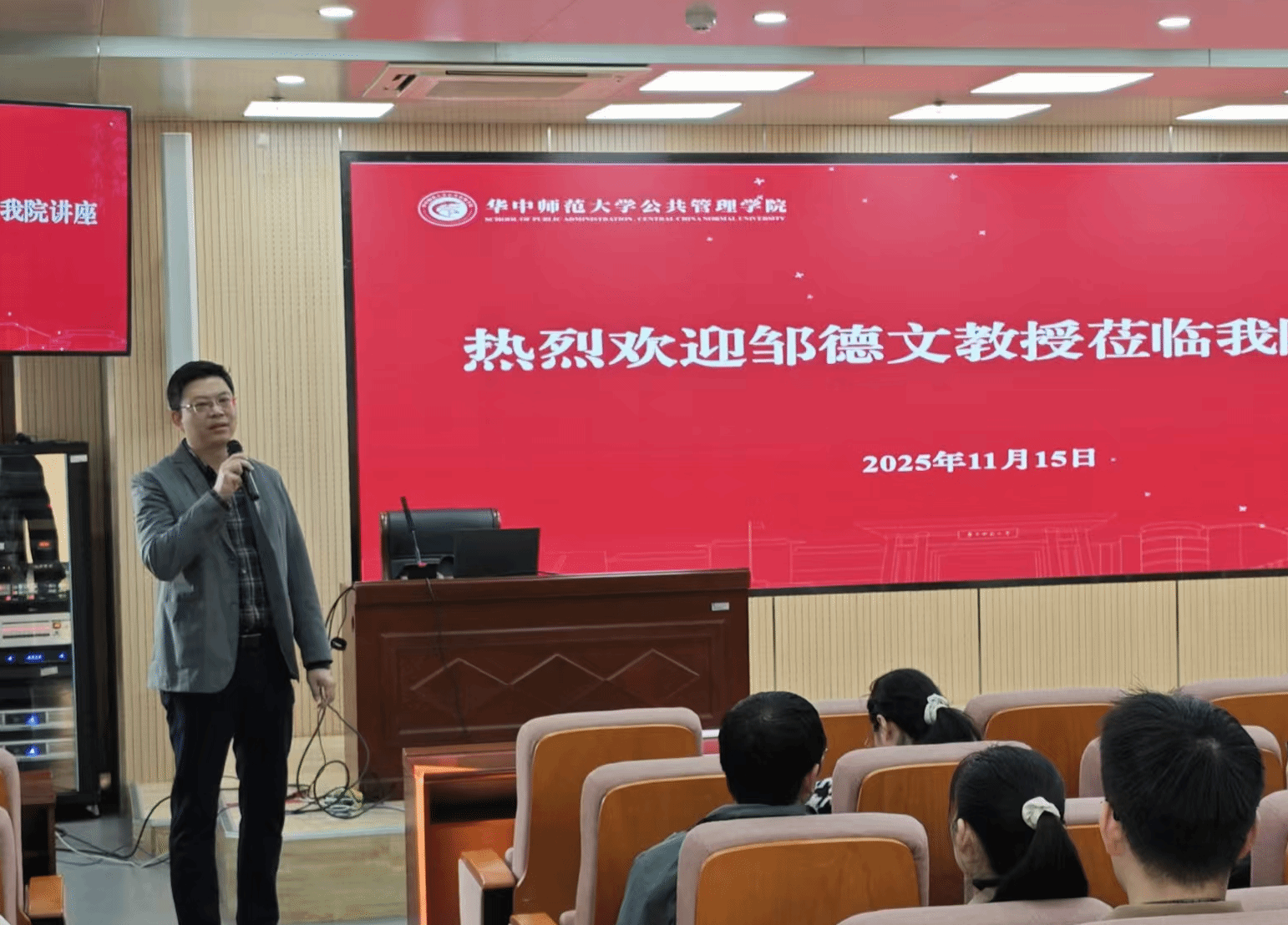 公管在线讯(通讯员 李仙蕊 闫明焱)2025年11月15日上午9时,公共管理学院“南湖问道・支点论坛”在南湖综合楼8001报告厅开讲。湖北省经济学会会长、华中科技大学博士生导师、二级教授邹德文应邀担任支点论坛的首讲嘉宾, 2025级MPA 学生及部分教师共同参与本次学术交流活动。论坛由公共管理学院副院长张祚教授主持,公共管理学院党委书记王海为南湖问道·支点论坛致辞。