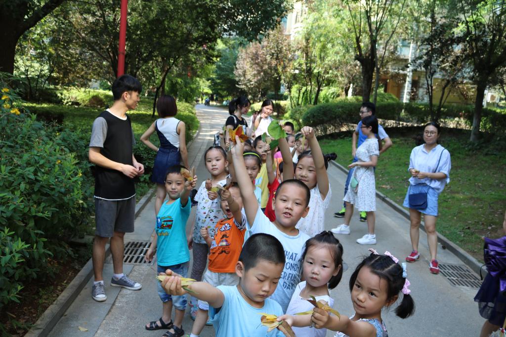 游戏结束后,在老师的带领下,志愿者和小朋友们一起在社区的小树林、路边的绿化旁边收集各种植物的叶子,小朋友们对于收集树叶很感兴趣,穿梭于草坪树林之间,收集到令人眼花缭乱的彩色叶片,孩子们欢快的笑声不绝于耳。就连带着孩子在路边跑步的老人也让自己的孙子孙女加入志愿团队,一起去寻找脉络清晰、色彩鲜亮的落叶,孩子们欢笑声传递到每一位志愿者的身上,令志愿者们难以忘怀。