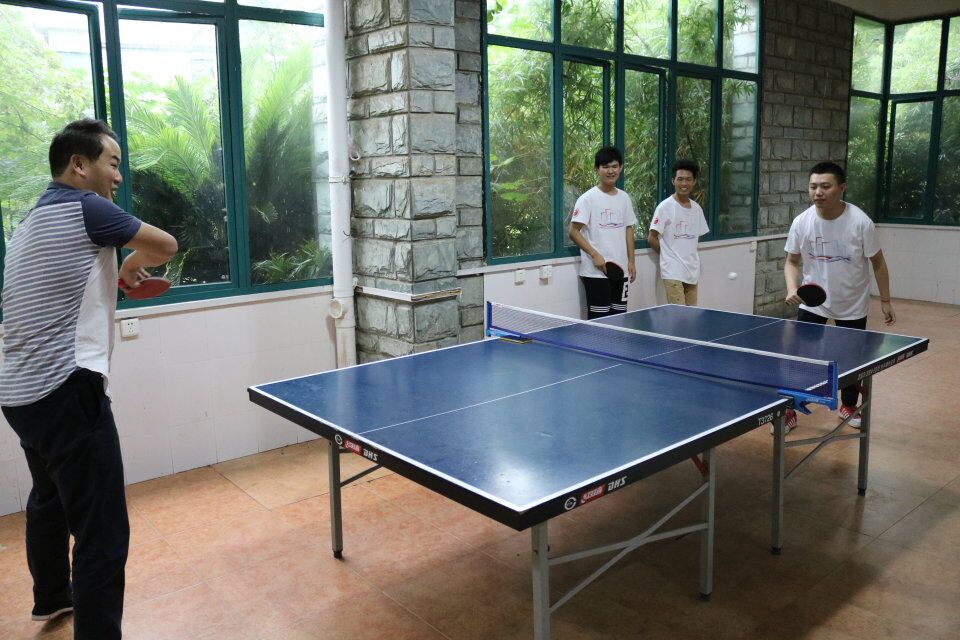 在社区里,居委会阿姨带大家来到了乒乓球馆,静谧的环境立刻散去,球台上响起了乒乒乓乓的声音。服务队的小伙子们早已按捺不住内心的激动,先行在球台上练了起来。发球、打球、捡球;推挡、上旋,反抽。花样打法,层出不穷。叔叔阿姨们也不甘示弱,开始认真热身起来。时间正好,由14级汪阿晨同学出阵首场,与一位身材壮硕的叔叔对战。比赛时,其他的同学们以及幼儿园老师们,也同样坐不住,开始打起了“野球”。参与人数越来越多,球拍不够用了,社区工作人员便想办法借球拍,里里外外来回跑。