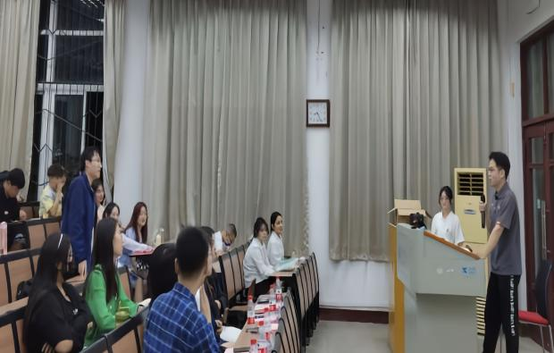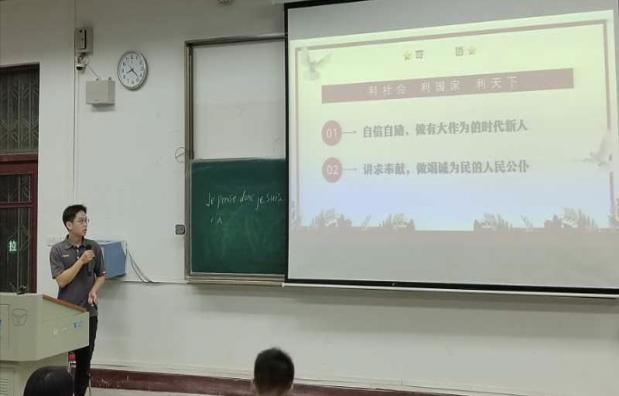 短暂休息后,预科优秀结业生分享会正式开始。首先进行分享的是潮乐门,他分享的主题为“如何度过大学”。他从亲身经历出发,讲述了预科一年的重要性以及本科期间的心路历程,从对未来的茫然到对法语专业的热爱。他建议同学们探索出属于自己的学习方法,端正学习态度。最后,同学们提出自己的疑惑,潮乐门结合自身经历为同学们答疑解惑。