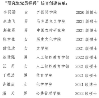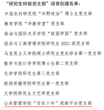 公管在线讯(通讯员廖伟)近日,“研究生样板党支部”和“研究生党员标兵”培育创建名单出炉。经自主申报、培养单位推荐、资格审查、通讯评审、会议评审、结果公示,学校最终产生了 10 个研究生样板党支部和 10名研究生党员标兵,我院“百社十年”观察平台党支部、2022 级硕士研究生温天成功入选。