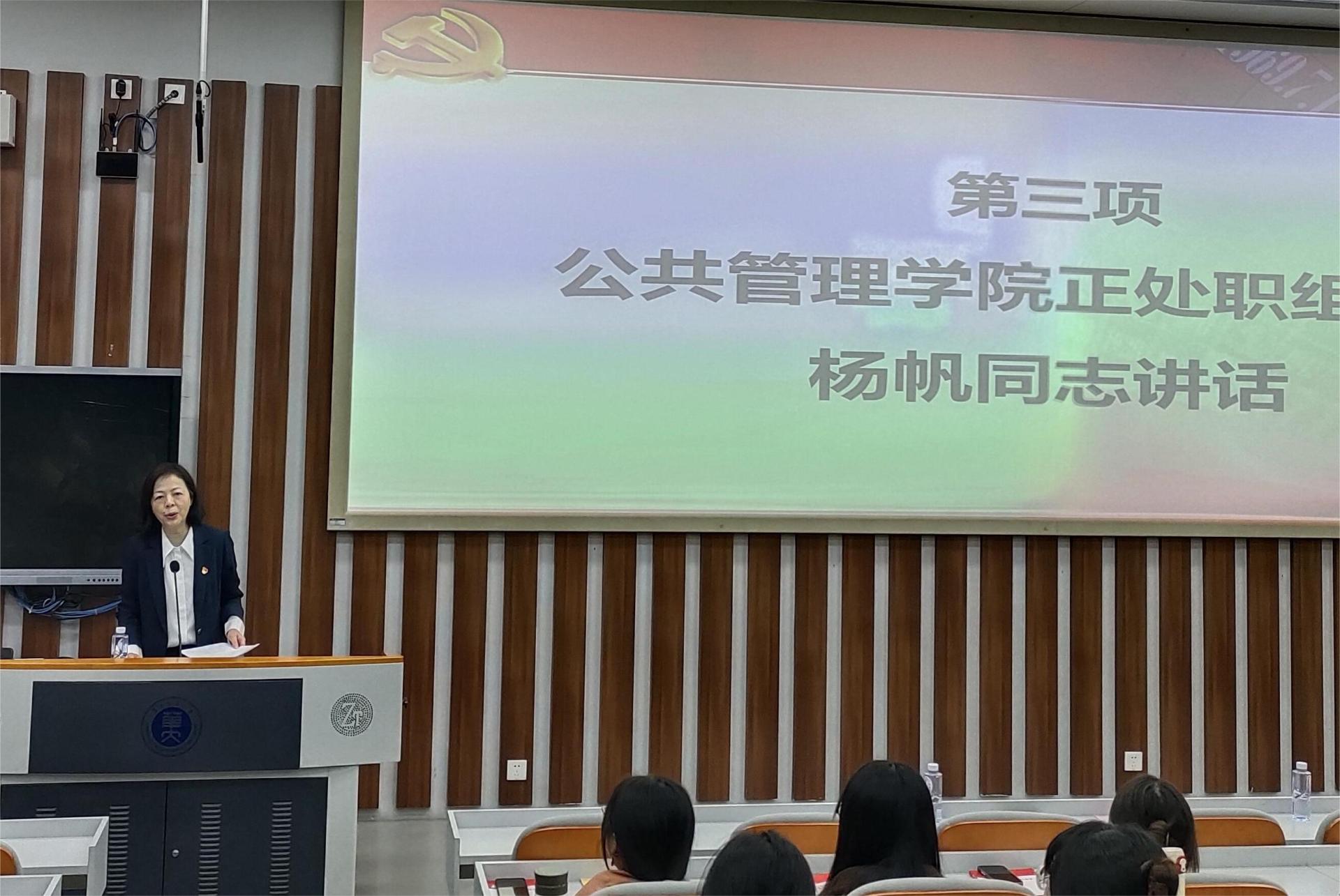 公共管理学院正处职组织员杨帆老师致辞。她首先代表第四分校对出席开班式的领导和老师表示热烈的欢迎,对各位积极分子同学们表示衷心的祝贺,对辛苦筹备会议的老师和同学表示由衷的感谢。杨老师对同学们提出三点希望:一是希望大家珍惜这次积极分子培训班宝贵的学习机会,顺利完成培训班的各项任务,争取早日入党,以成为未来国家建设的中流砥柱和栋梁之材。二是希望每位同学在入党积极分子培训班上,提升学习效果。她号召同学们,以习近平总书记在学习贯彻习近平新时代中国特色社会主义思想主题教育工作会议上的重要讲话为根本遵循,努力做到以学铸魂、以学增智、以学正风、以学促干,以取得实实在在的成效。三是希望同学们严守学习纪律,严格遵守党校纪律。同时做到党校培训和专业学习的合理统筹、系统安排、相互促进、相互提升。