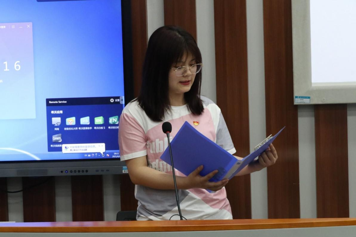 学生会主席王霏从疫情背景下团委学生会在工作中攻坚克难、戮力前行出发进行阐述。她表示团委学生会在组织架构的改革创新基础之上,顺利完成了各项工作。王霏将工作概括为以制度建设为保障,强化青年凝心聚力;以思想引领为核心,筑牢青年理想信念;以服务同学为主线,满足青年切实需求;以创新实践为载体,服务青年成长成才四个方面。在发言最后,她表达了对新一届团委学生会成员能够与时俱进、开拓创新,圆满完成改革任务的期待。