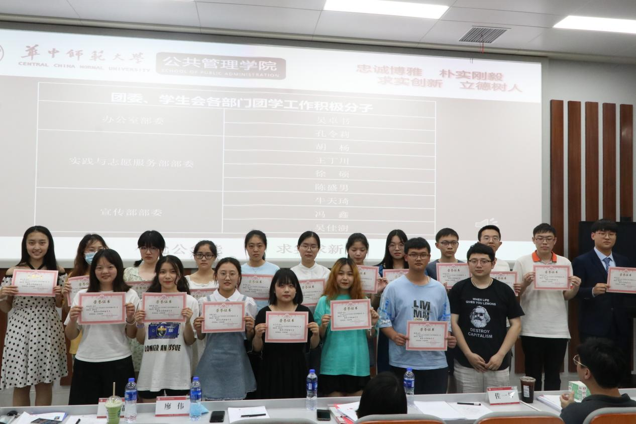 主席团述职后进入表彰环节。在学院的关心和领导下,全体团学干部通过自身努力,为一年里的团学工作贡献了强大的青春力量。经部门内部推优、自主报名以及民主投票,最终评选出吴卓书、孔令莉、胡杨等共24名同学为“团学工作积极分子”。曾艳老师、佐一男老师、廖伟老师为获奖同学们颁奖。