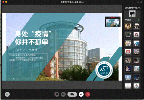 最后,学院邀请心理学院研究生李慧芝同学带来了一场题为“身处疫情 你并不孤单”的心理健康讲座,她给大家分享了疫情期间如何缓解焦虑,如何处理亲密关系和如何自我探索与成长等内容,为大家正确面对疫情、调整好心理情绪提供了专业建议。至此,本次会议圆满结束。