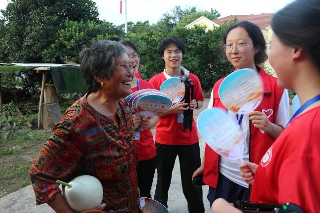 在走访过程中,队员们观察到茅圻村的青壮年村民大多已外出打工,留在村中居住的多为留守老人和留守儿童。村里的老人们看到余巧和实践队的来访,倍感欣喜,纷纷聚拢来打招呼寒暄。实践队员们为村民送上凉扇,并与老人家们拉起家常,询问他们的身体健康和生产生活情况。在与老人们交流的过程中,村民们对余巧和“巧巧工作室”的志愿者赞不绝口,“有困难找余巧,有烦恼找余巧”已成为村民们的口头禅。
