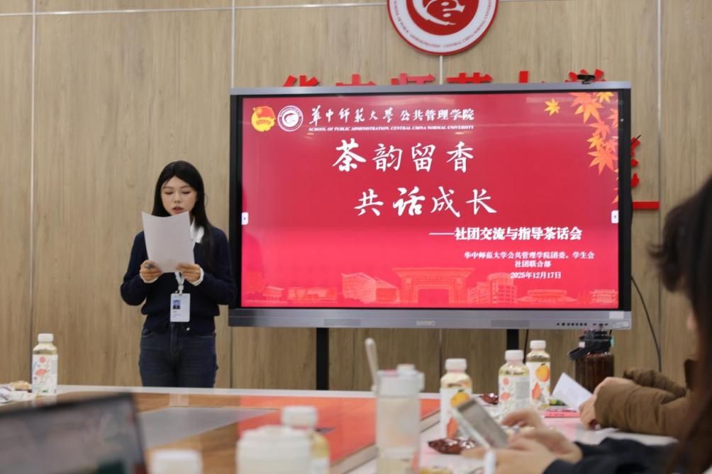 公管在线讯(通讯员 焦子轩 张莹)12月17日下午,公共管理学院“茶韵留香 共话成长”社团交流与指导茶话会在南湖综合楼9002教室举行。学院团委书记张子规,社团联合部全体成员,挂靠社团、辩论队负责人及成员代表参加。活动由社团联合部部委金垚主持。