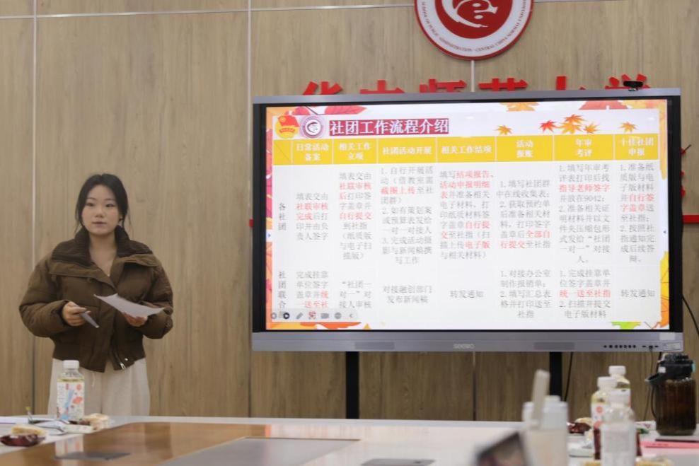 社团联合部主要负责人许心怡就部门职能与日常管理工作进行了系统阐述,内容涵盖社团常规工作安排、标准化流程梳理及财务报账规范等方面,进一步细化了管理要求,为各社团后续规范运作提供了清晰指引。