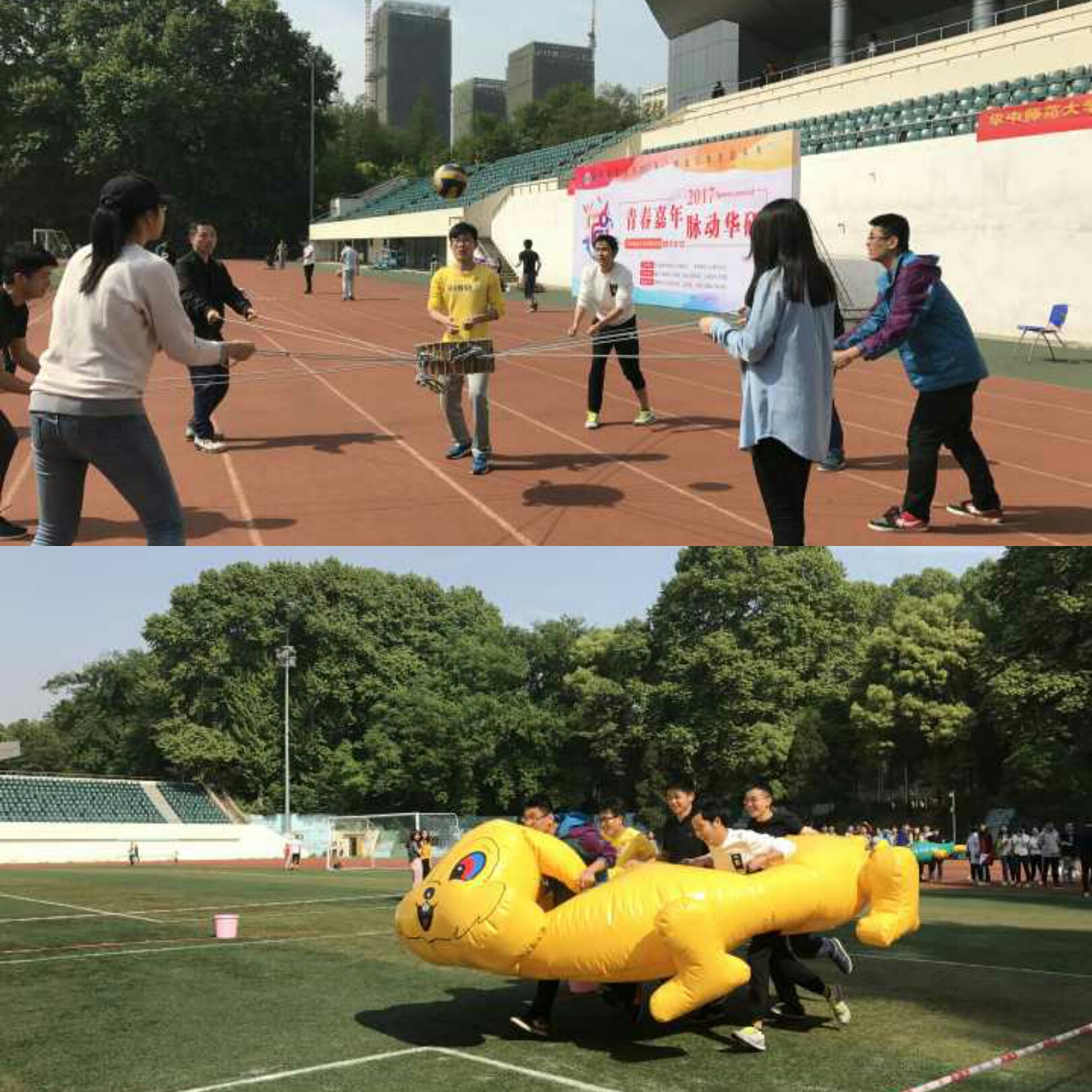 赵佳琦、向颖、田梦玮、杨雅惠、孙振辉、王凡帆、常飞、彭泉盛、柯楠、曾志鸣十位同学代表我院参赛。面对狭窄的“电网”,不仅是体力更是策略的比拼,大家群策群力,积极出谋划策、排兵布阵;疯狂指压板让人“望即生畏”,同学们“毅然决然”、忍痛上场,真真切切的体会了一次痛并快乐着的感觉;众星捧月则是对参赛者默契与配合的考验,尽管练习时间紧张,但凭借同学们的出色的团队合作最终在这一环节取得了第五名的好成绩;龟兔赛跑环节中,套上了“大黄鸭”的各位同学尽管面临阻力重重仍然努力奔跑,诠释着拼搏奋斗的体育精神。