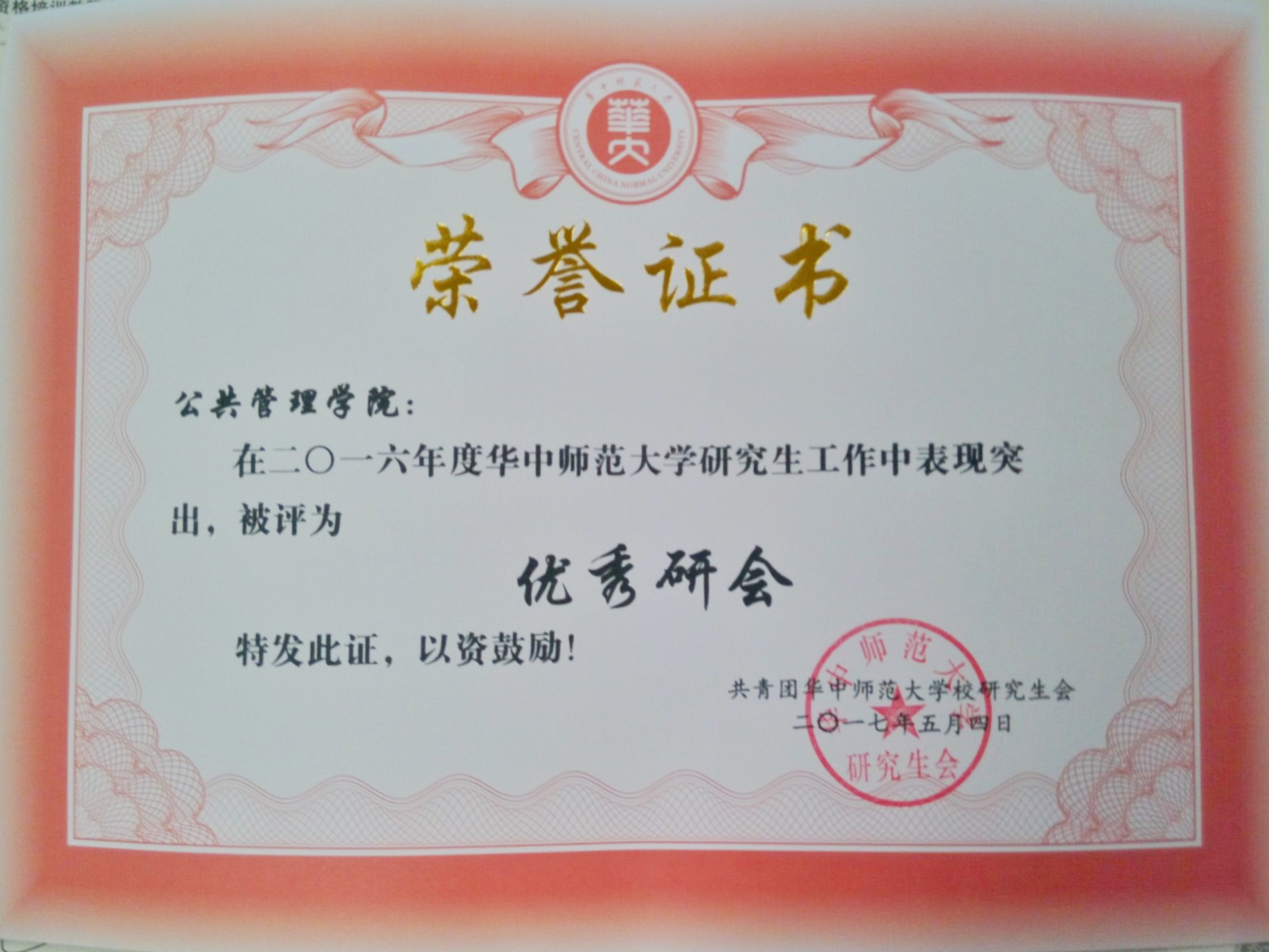 公共管理学院研究生讯(通讯员:熊梦莹) 近日,我院研究生会在2016年度基层学院研究生会考核评优工作中荣获“优秀研究生会”荣誉称号。