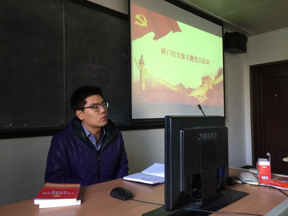 本次活动的主要内容有两个部分组成,一是支部书记讲十九大活动。由支部书记张子航同志向全体党员细致的讲解党的十九大所产生的重大历史论断和理论成果。第二部分是支部内党员十九大学习交流活动。有每一位党员结合自身的学习和认识发表自己对十九大系列讲话感受和学习成果。党的十九大刚闭幕不久,产生丰富的系列知识理论和精神,应该全方位的、深层次、广领域自上而下向基层的党组织进行铺广开来。