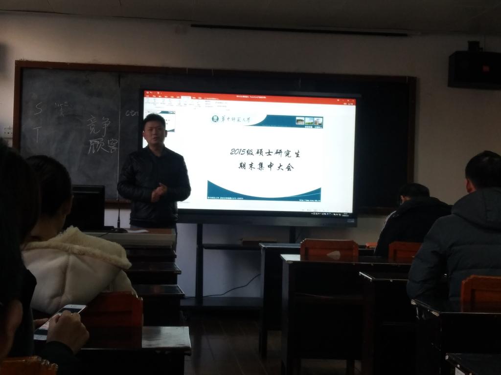 公管在线讯(通讯员 石燕芳)1月12日上午,我院成功召开了2015级硕士研究生期末集中大会。大会对本学期的研究生工作进行了总结回顾,并对即将到来的寒假工作进行了预安排。研究生教学秘书欧阳铮老师、研究生辅导员魏寅老师以及兼职辅导员胡丹出席会议,除个别请假的学生之外,全体15级硕士研究生均出席了此次会议。