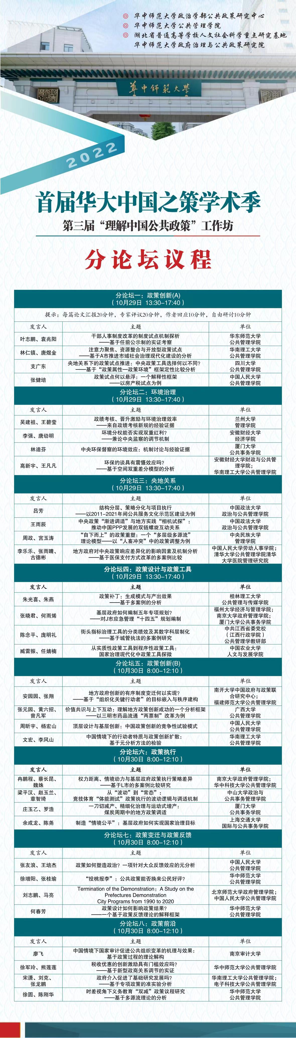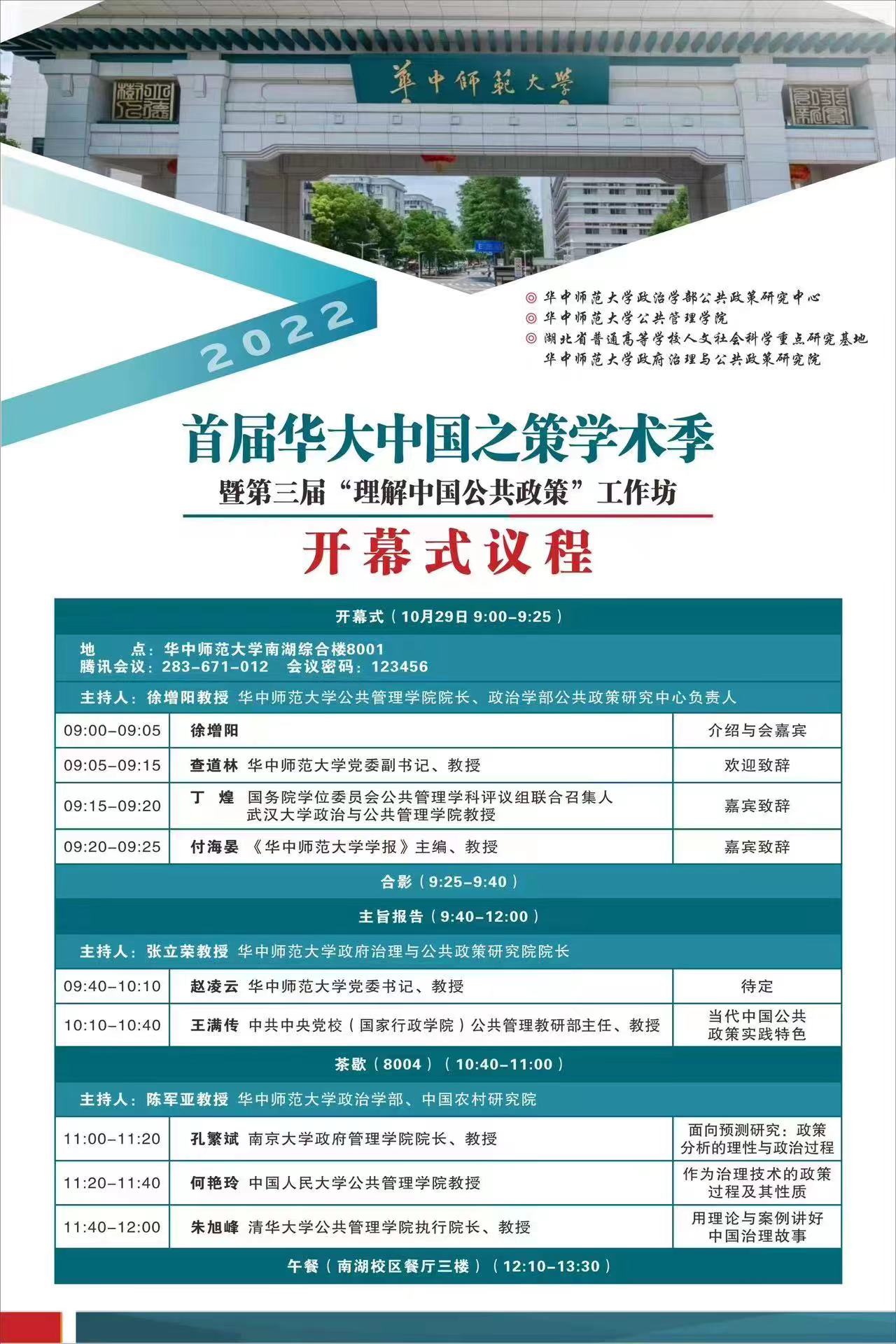 “华大中国之策学术季”是华中师范大学政治学部在整合有关成员单位原有学术活动的基础上,策划的升级版公共政策学术品牌,旨在通过学术大讲堂、主题演讲、专题研讨、国际会议、学术成果展示等各类活动,为公共政策理论和实践工作者提供智力碰撞、智力协作、智力创新、智力汇聚的深度交流平台。