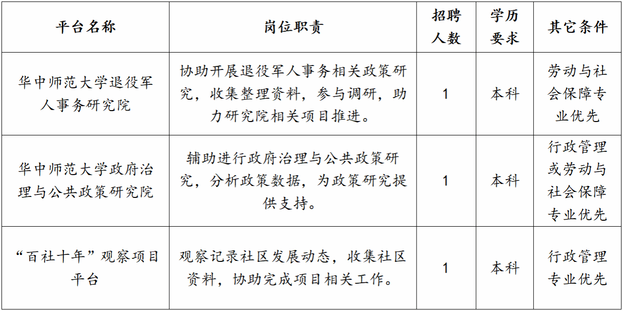 华中师范大学公共管理学院前身是成立于1993年9月的管理学院,因学科调整于2012年更名为公共管理学院。学院是全国首批退役军人事务研究基地——华中师范大学退役军人事务研究院的牵头建设单位,湖北省普通高校人文社会科学重点研究基地——华中师范大学政府治理与公共政策研究院挂靠学院。2021年,学院列入政治学世界一流学科建设单位,负责“城市基层治理”和“公共政策”两个方向的建设。为满足教学科研工作需要,现面向社会公开招聘科研助理。具体招聘事宜公告如下: