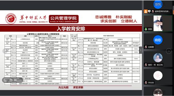 公管在线讯(通讯员:周小燕)9月6日晚上7:30,公共管理学院新生入学教育启动仪式在腾讯会议线上举行。我院党委书记揭辉,院长卢新海,本科生新生辅导员李立,本科生班主任张奎力、李名峰、魏来,团委书记佐一男,研究生辅导员廖伟、兼职辅导员宗佳敏,预科生辅导员李敏琳、班主任杨亚黎、曾爽及全体新生参加启动仪式。会议由学院党委副书记曾艳主持。