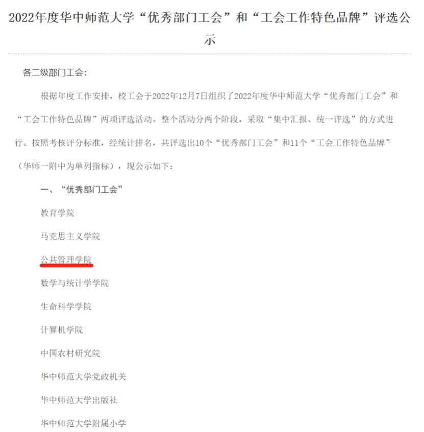 公管在线讯(通讯员 廖伟)近日,在学校2022年度“优秀部门工会”和“工会工作特色品牌”评选中,我院工会获评“优秀部门工会”。